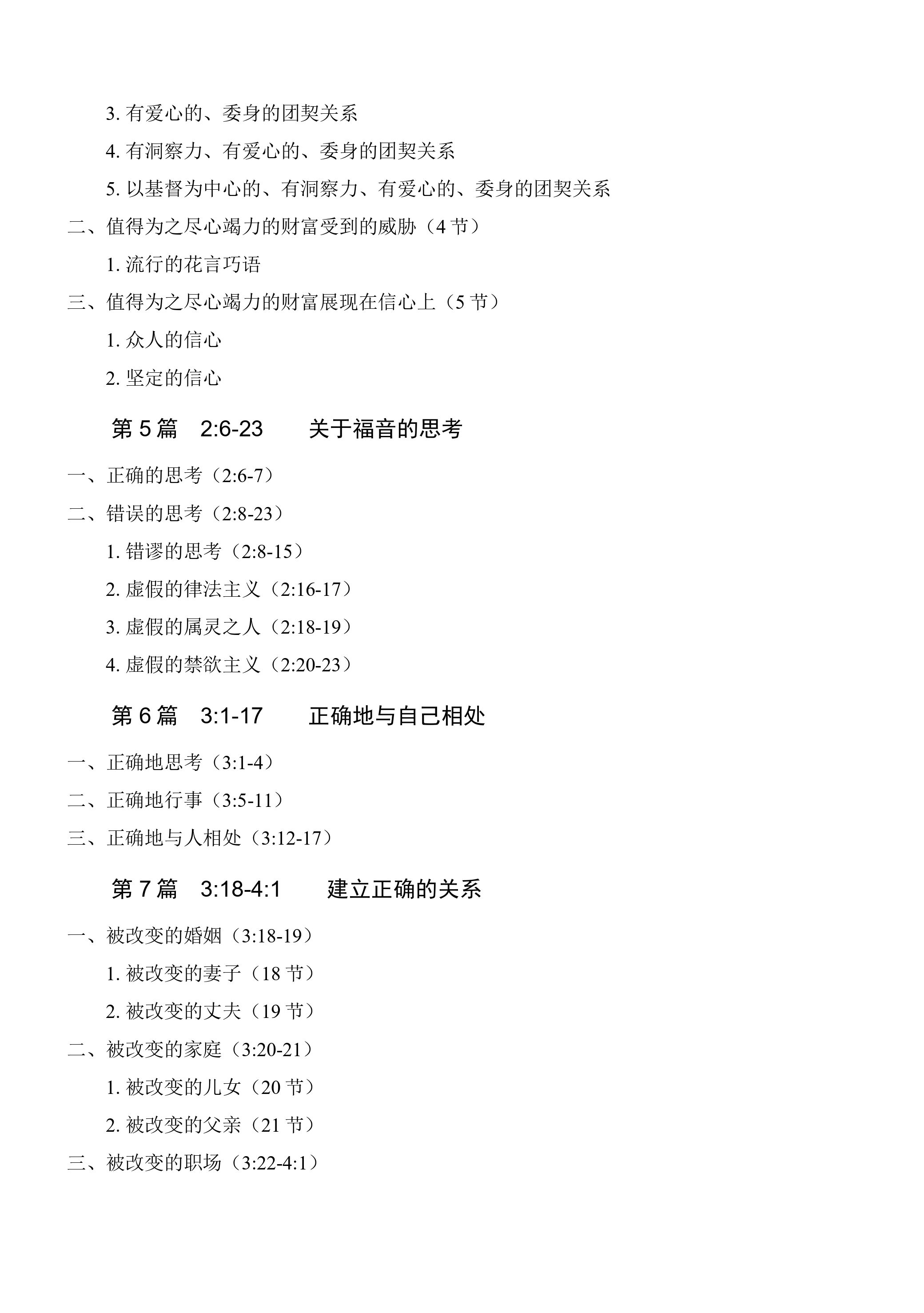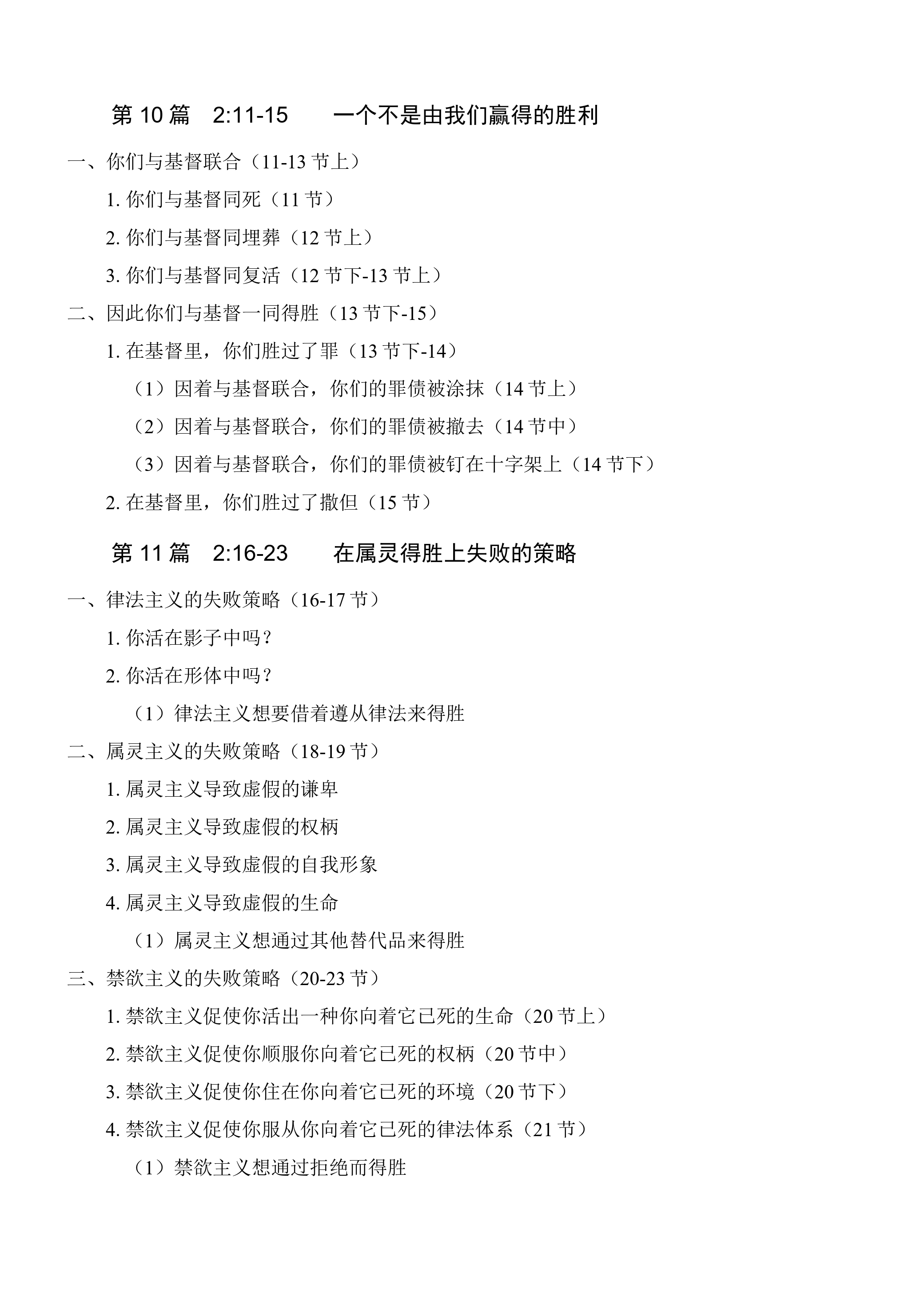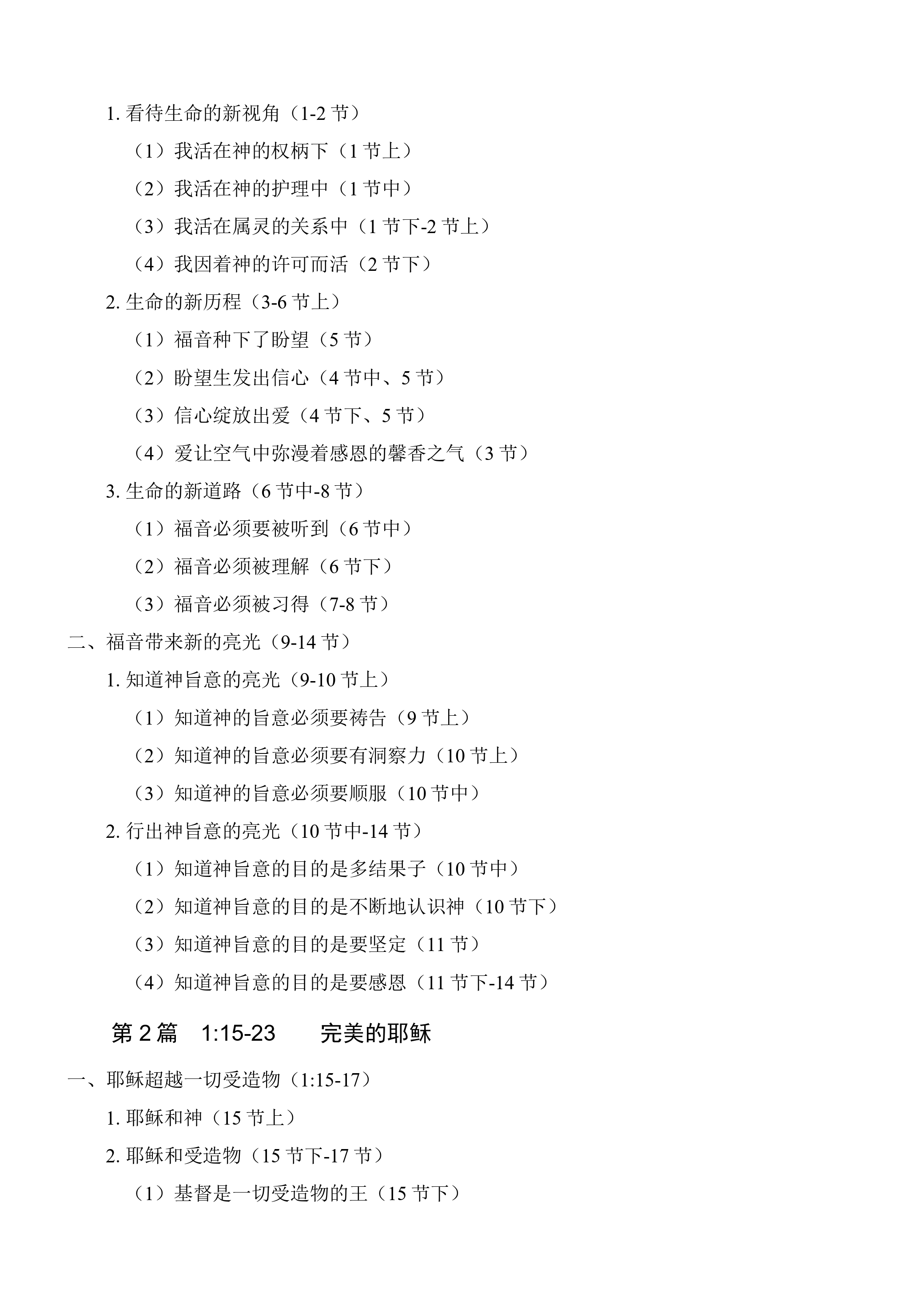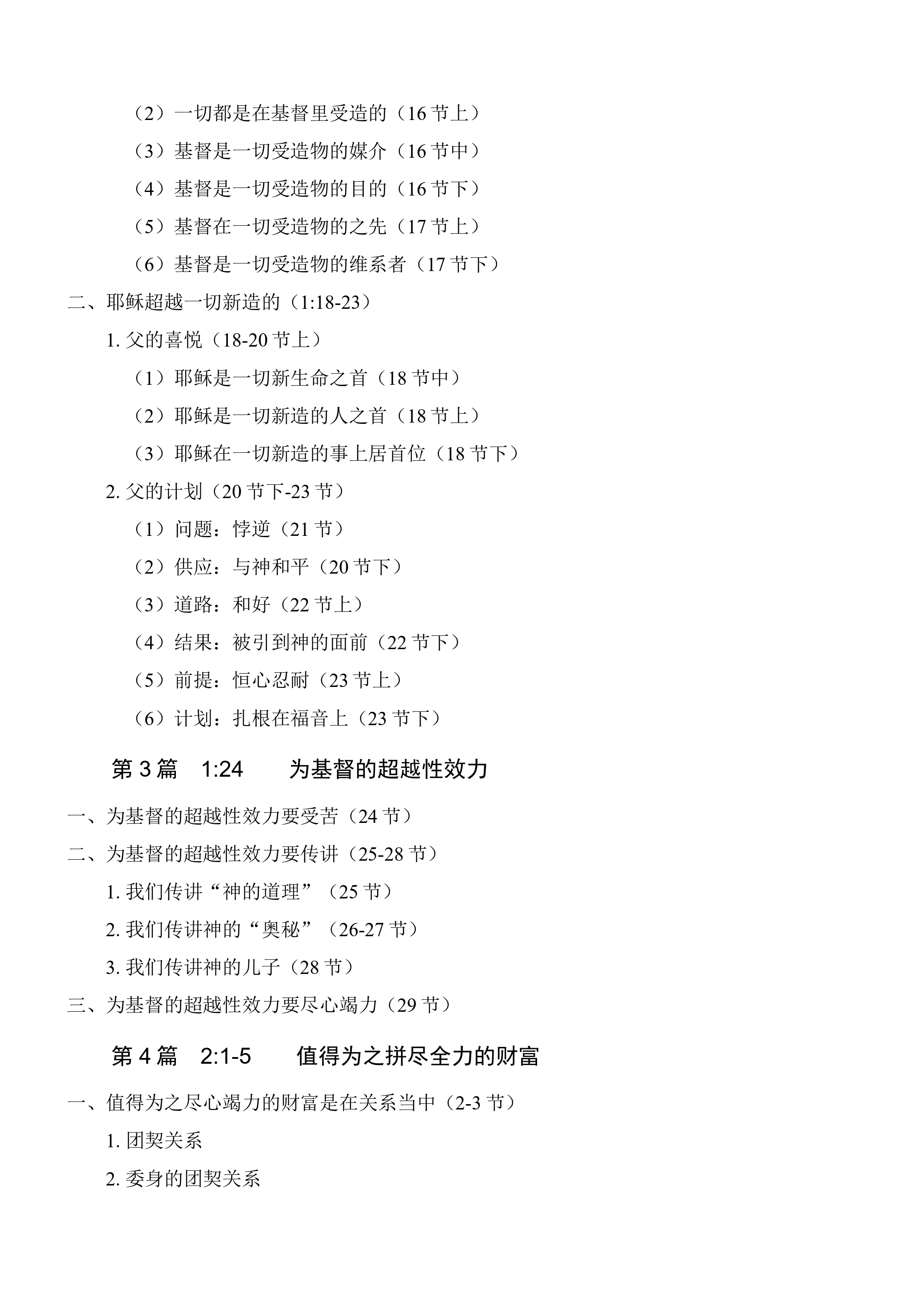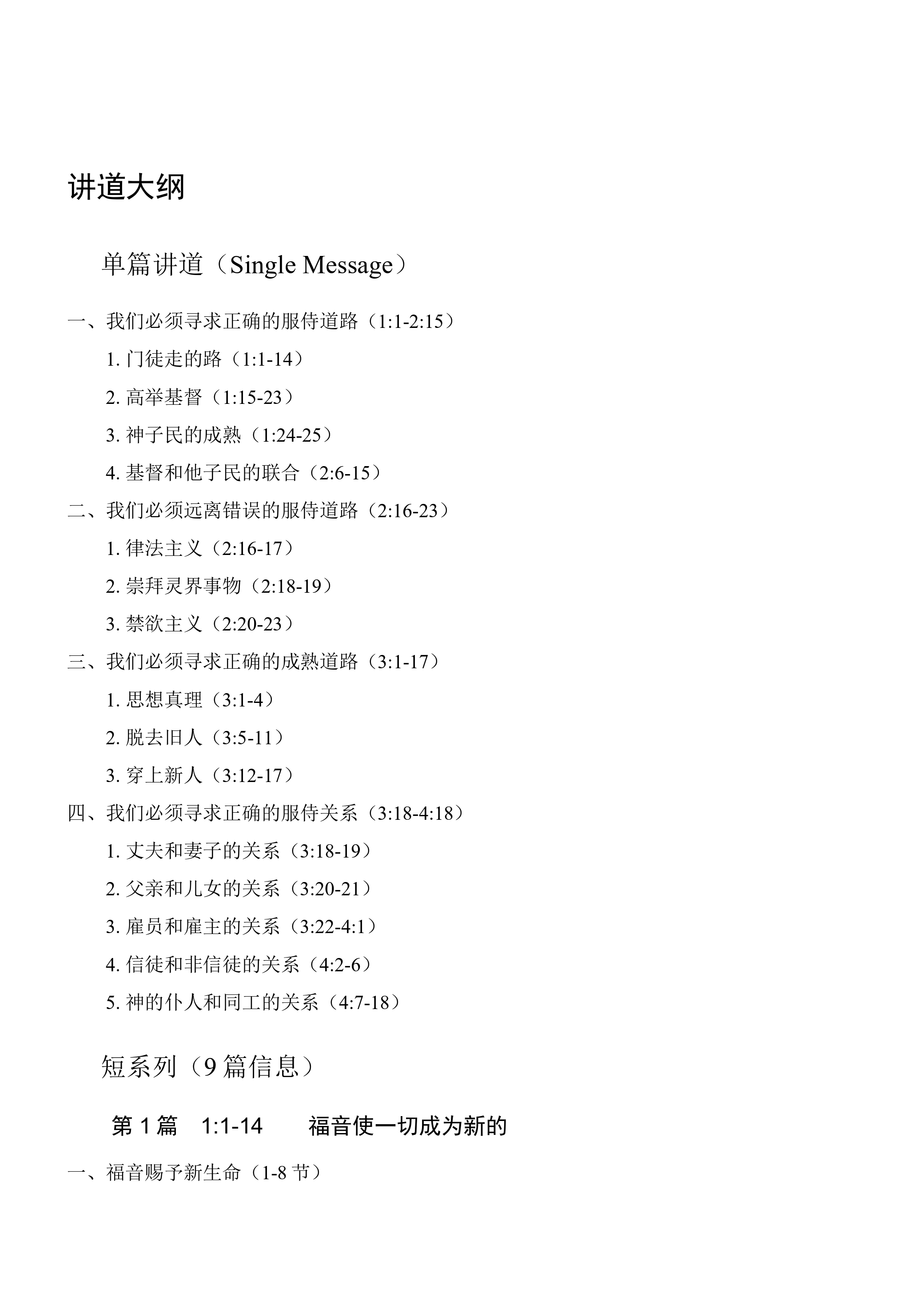 接下来是针对系列讲道和独立主题讲道的一些建议。首先,我给出歌罗西书的解经大纲,接下给出讲解歌罗西书的三种可能的方式:(1)一篇覆盖整卷书的独立讲道;(2)一个较短的系列信息;(3)一个较长的系列信息。当然,这些还可以进一步扩充。在有些情况下,你划分书信的方式可能与我在这里提供的有所不同。希望我的建议能为你讲解这些神圣话语提供一些素材。作为神的仆人,你的责任就是反复咀嚼这些经文,直到神从他的话语中把所要给他子民的信息显明给你。