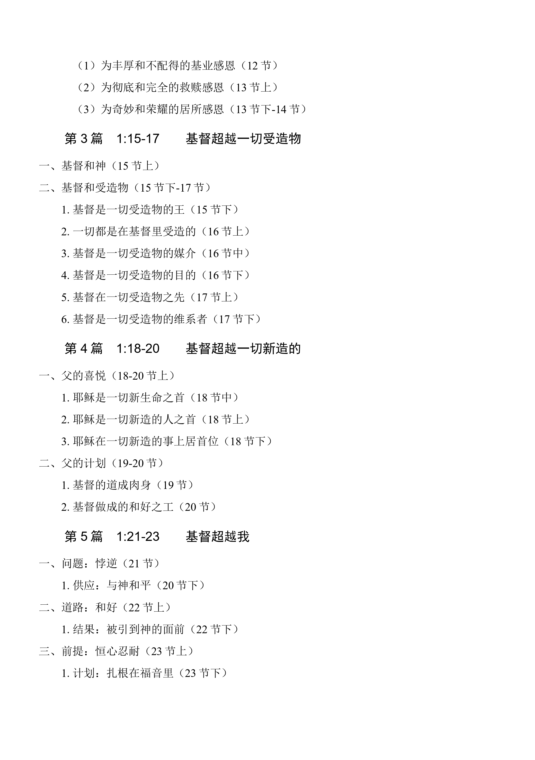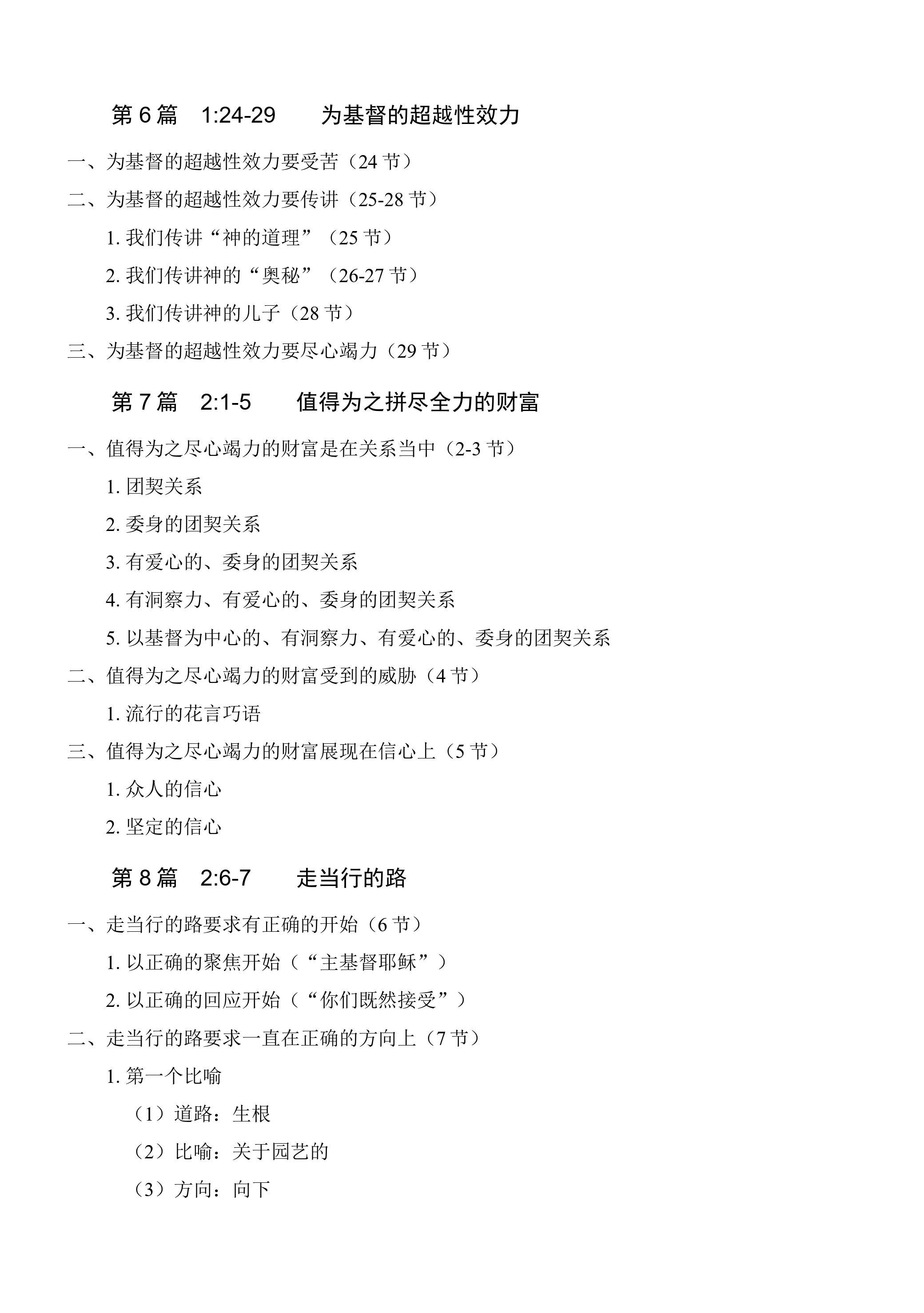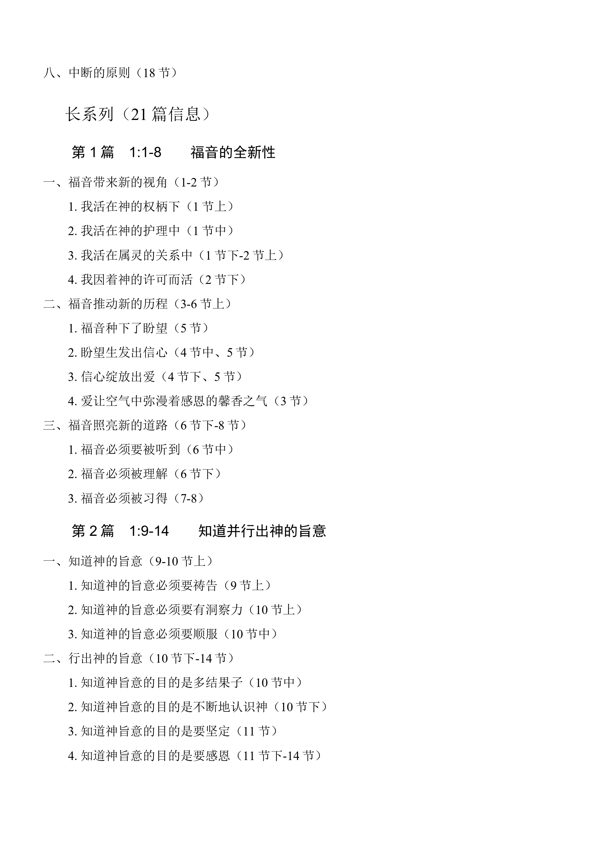 接下来是针对系列讲道和独立主题讲道的一些建议。首先,我给出歌罗西书的解经大纲,接下给出讲解歌罗西书的三种可能的方式:(1)一篇覆盖整卷书的独立讲道;(2)一个较短的系列信息;(3)一个较长的系列信息。当然,这些还可以进一步扩充。在有些情况下,你划分书信的方式可能与我在这里提供的有所不同。希望我的建议能为你讲解这些神圣话语提供一些素材。作为神的仆人,你的责任就是反复咀嚼这些经文,直到神从他的话语中把所要给他子民的信息显明给你。