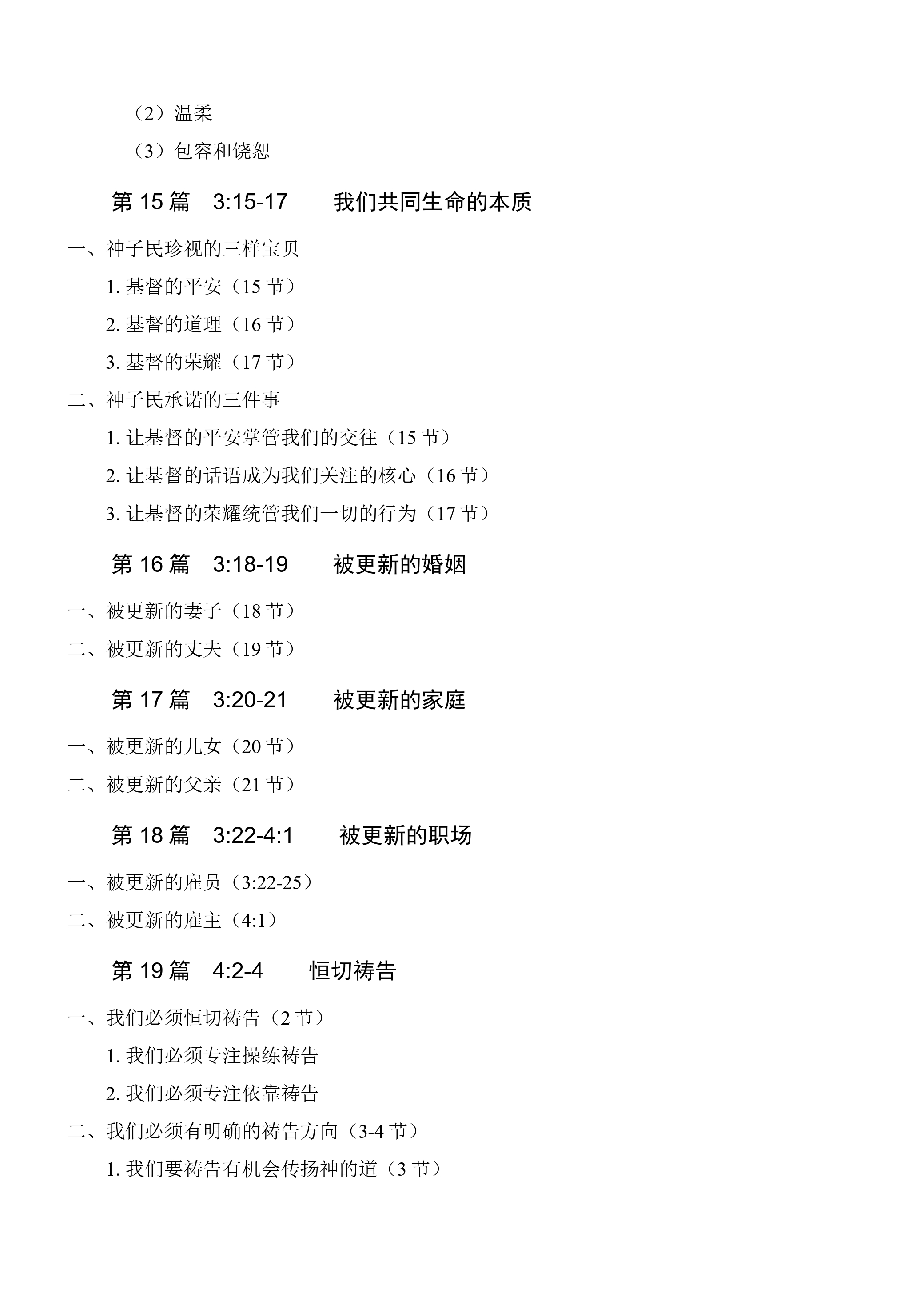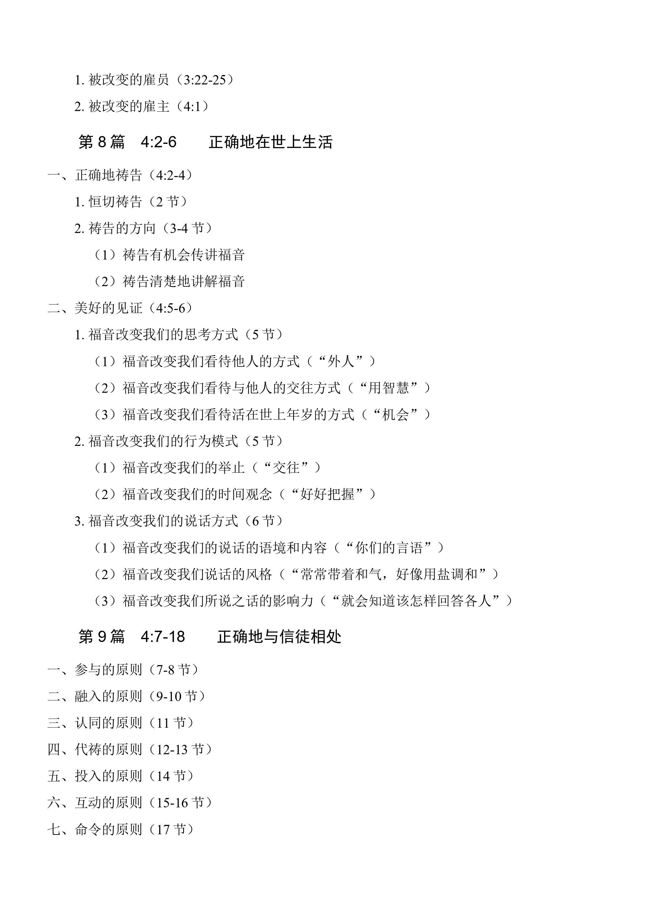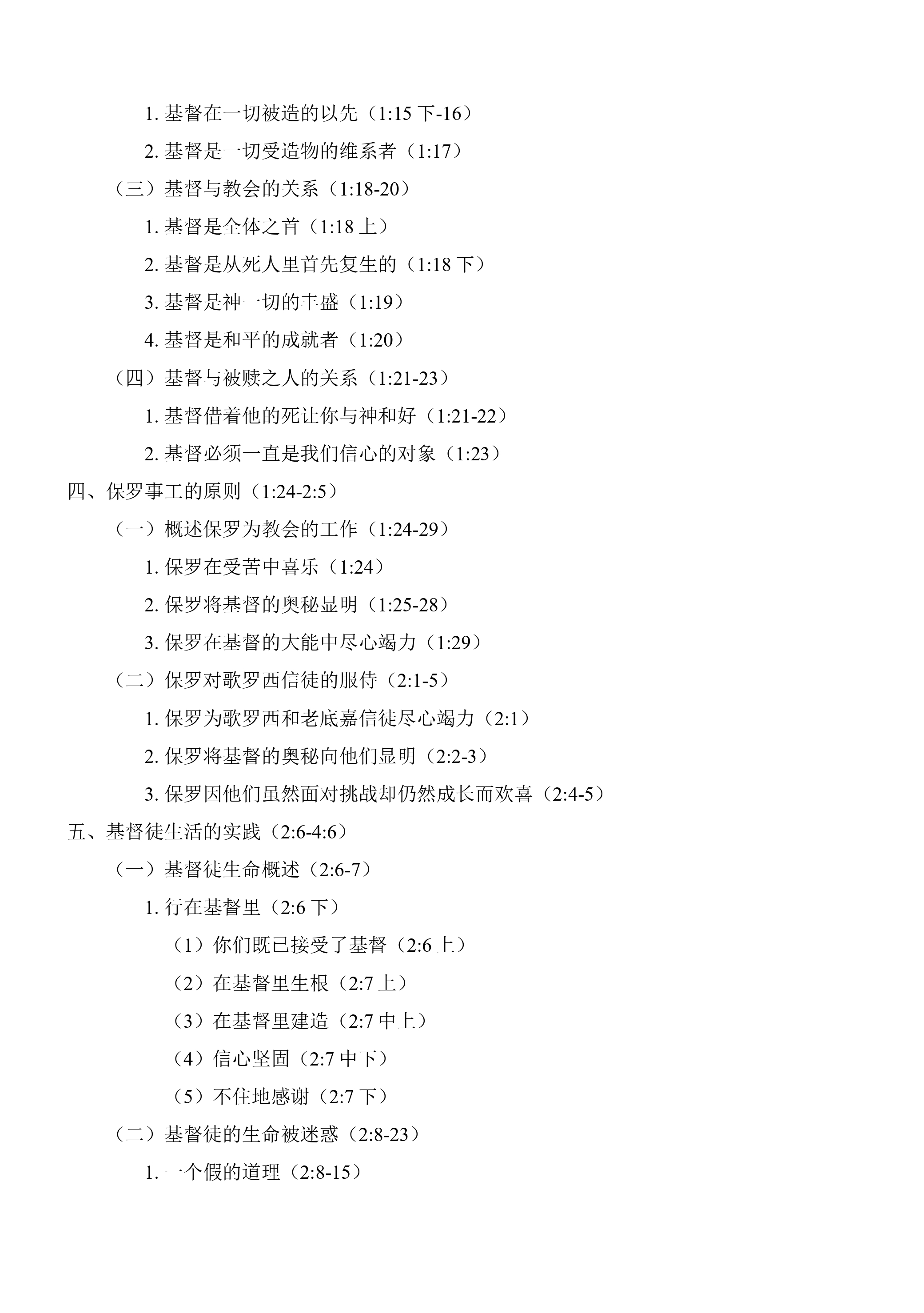 接下来是针对系列讲道和独立主题讲道的一些建议。首先,我给出歌罗西书的解经大纲,接下给出讲解歌罗西书的三种可能的方式:(1)一篇覆盖整卷书的独立讲道;(2)一个较短的系列信息;(3)一个较长的系列信息。当然,这些还可以进一步扩充。在有些情况下,你划分书信的方式可能与我在这里提供的有所不同。希望我的建议能为你讲解这些神圣话语提供一些素材。作为神的仆人,你的责任就是反复咀嚼这些经文,直到神从他的话语中把所要给他子民的信息显明给你。
