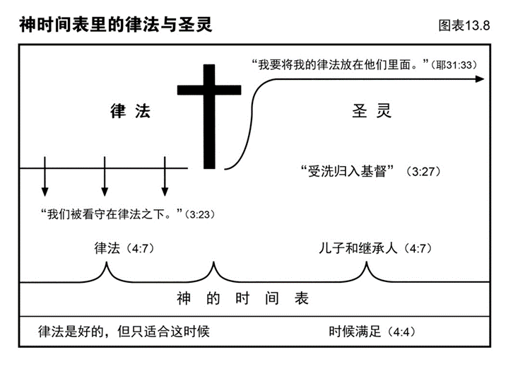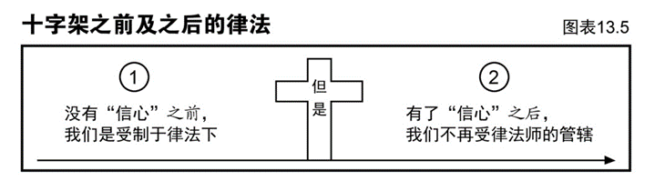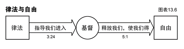 保罗从未说过“神的律法”与“基督徒的自由”是互相冲突、不能调和的。3章24节和5章1节指出两者是有密切关系的,如图表13.6所示。
