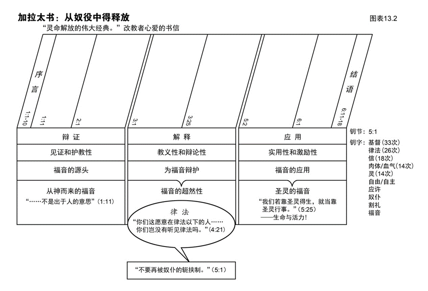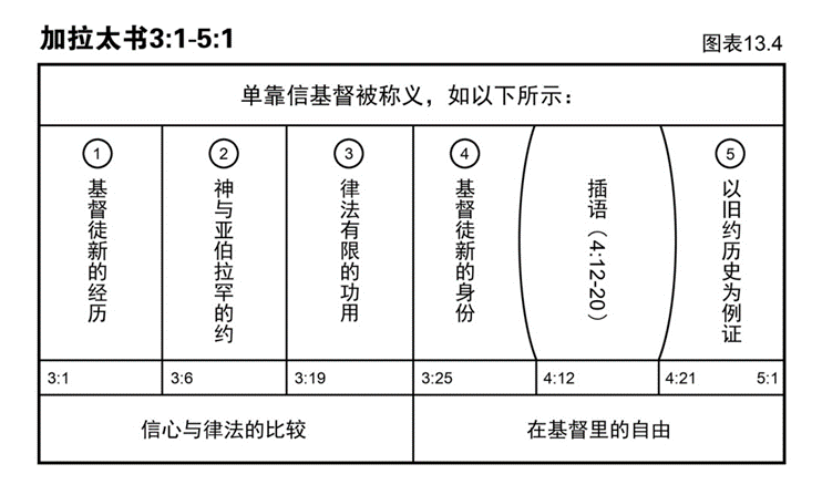 加拉太书的中间部分是信之教义的核心,此处保罗就像一位受神指示的神学家。在3章1至24节,保罗比较信心与律法,因为两者与称义相关联;在3章25节至5章1节,保罗论及信徒在基督里有自由,不受律法束缚。这部分的大纲见图表13.4。