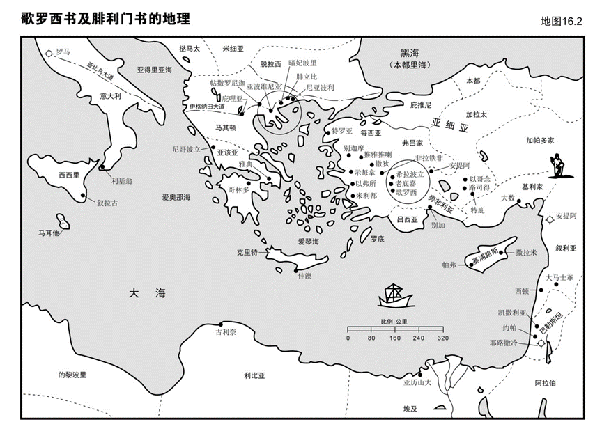 参看地图16.1(歌罗西周围的环境),注意歌罗西是吕科斯河谷(Lycus Valley)内的“三大城市”之一。这地方距离以弗所大约有一百六十一公里之远。(另参看地图16.2,那里有更详细的地理资料。)在公元前的五个世纪,歌罗西被誉为“弗吕家的大城”(the great city of Phrygia);然而在保罗的时代,她仅是一座小城罢了。这种转变主要是因为当以弗所与幼发拉底谷之间的贸易路线偏离了歌罗西之后,老底嘉和希拉波立这些邻近城市便随之崛起了。[1]
