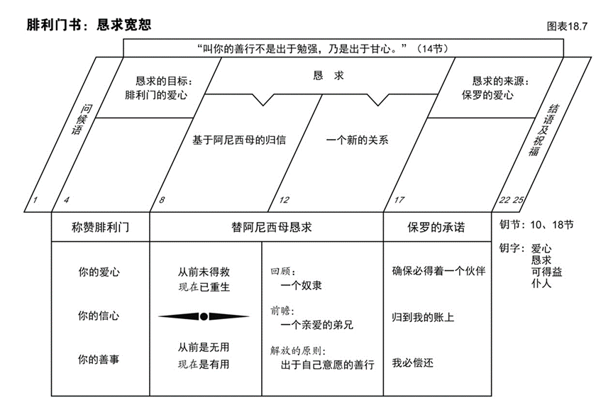 ① 阅读图表18.7,从以下这两个大纲中,留意那有次序的思路发展:恳求的目标——恳求——恳求的来源;称赞腓利门——替阿尼西母恳求——保罗的承诺。