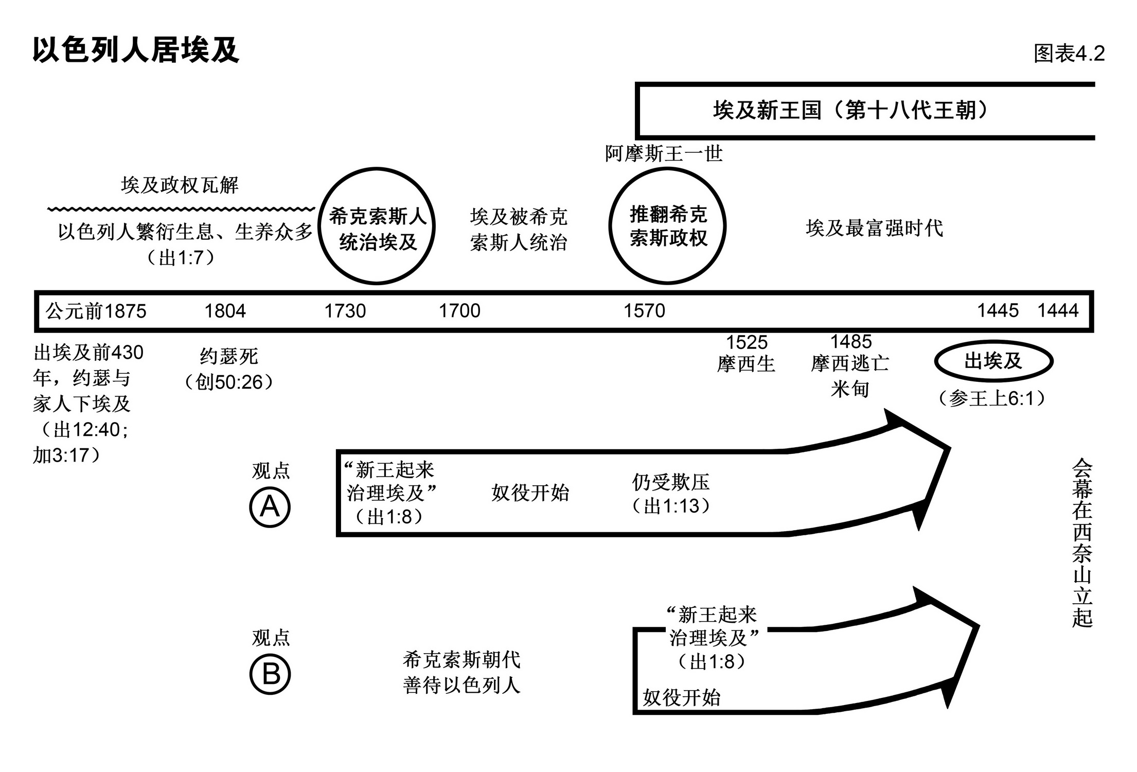 图表4.2说明出埃及记重要的历史背景。请细读这个图表并注意图表中的各项,以明了书中的历史背景。