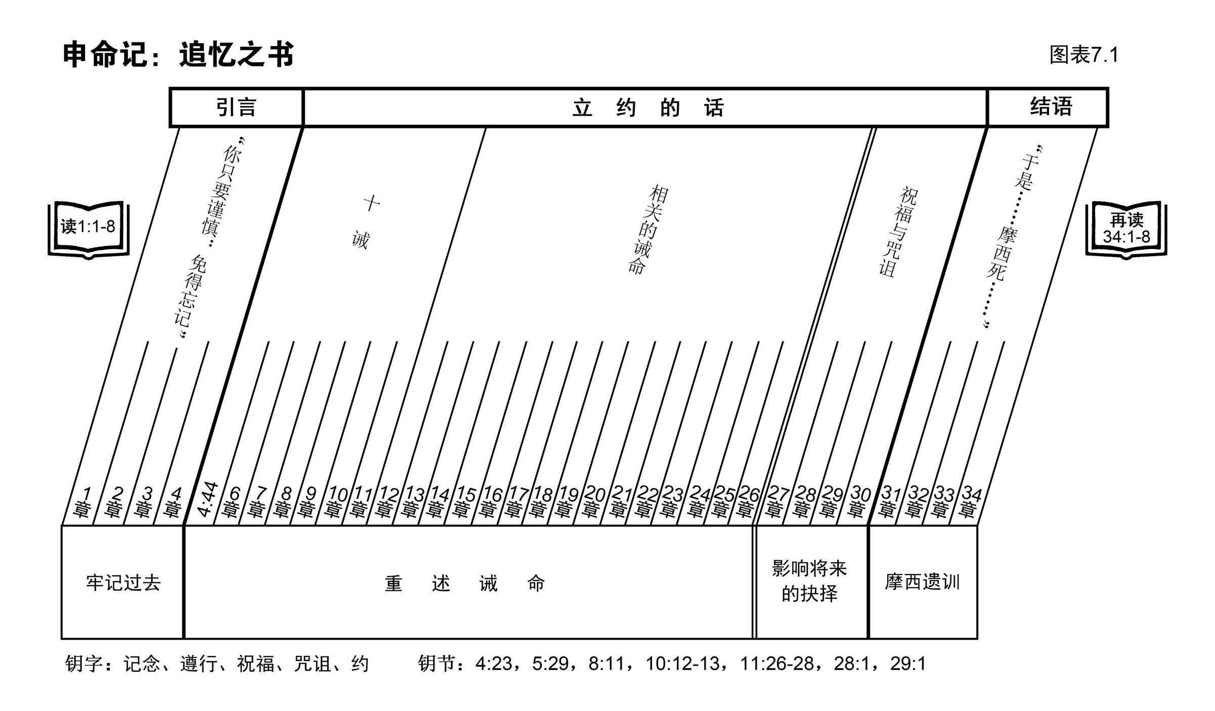 ① 先把申命记速读一遍,注意每章的第1节和圣经中的分段标题。读的目的是获得概要,不要为细节停顿下来。尝试感受一下摩西讲这些信息时的气氛、情景,然后慢慢地从头再读一遍,写下每章的章题。(注意:图表7.1不用第5章1节分章,改用第4章44节划分。读的时候请尝试了解这个分法。)