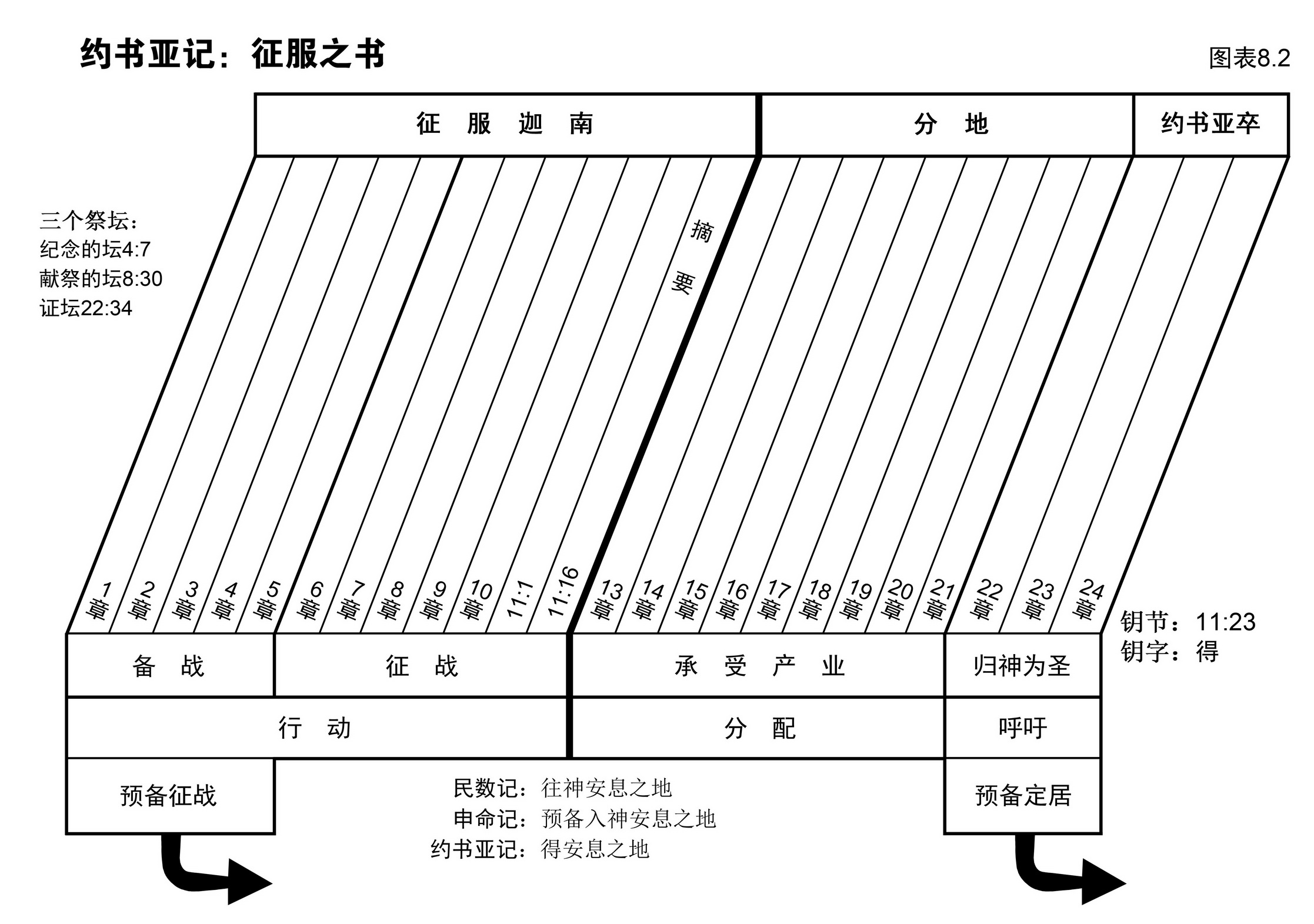 ⑨ 请注意图表8.2与8.3相同的分法。综览图表8.2如何将全书划分成两大部分?试从11章16-23节中,找出一句话,说明约书亚及其军队的功绩。请留意该两大段的分法。
