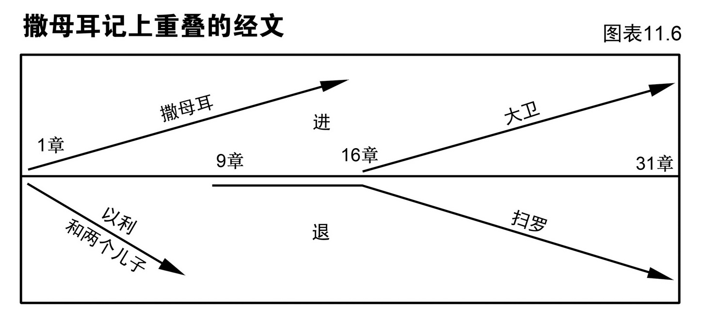 撒母耳记上下的内容前后呼应,文气相通,可见于图表11.2的纲要。由于扫罗的生平要到撒母耳记下方告结束,我们便把撒母耳记下第1章并至前书的末段。