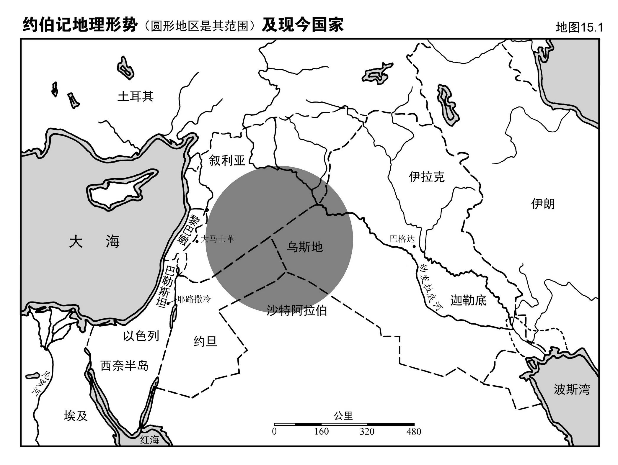 ① 约伯是乌斯地人(1:1),这地位于巴勒斯坦东北,靠近沙漠(1:19),大概在大马士革城与幼发拉底河之间,即今日的伊拉克和沙地阿拉伯的交界线(参地图15.1)。1章3节说约伯住在“东方”。