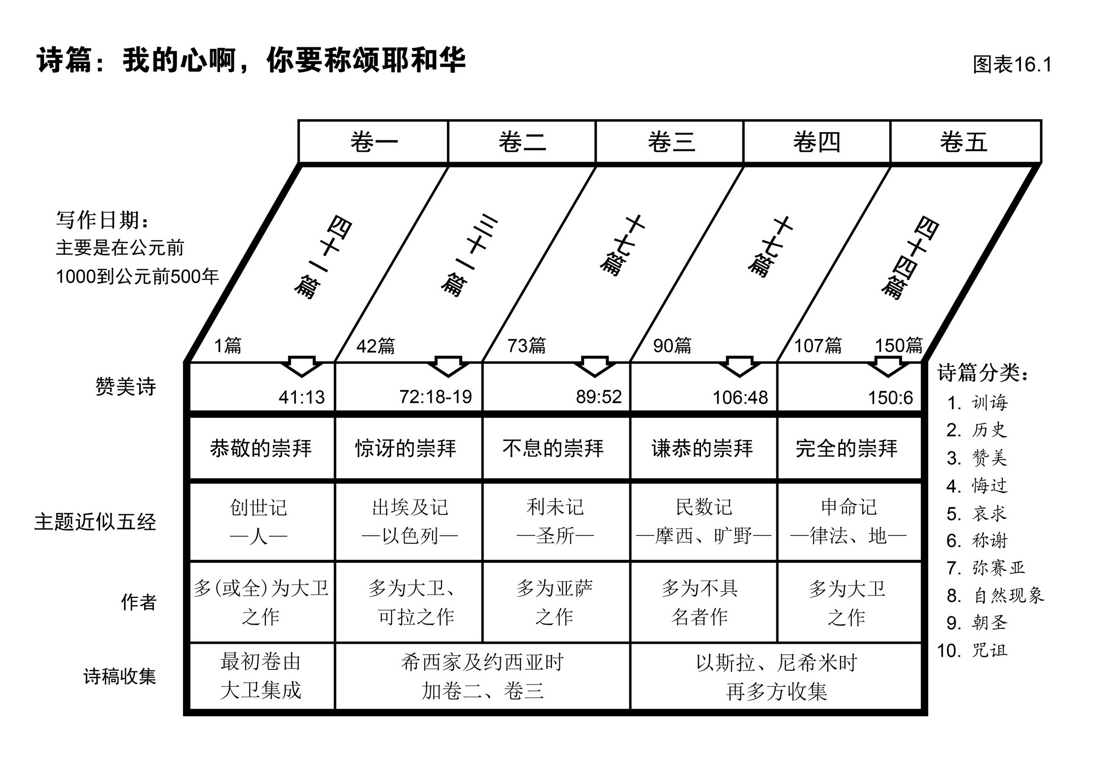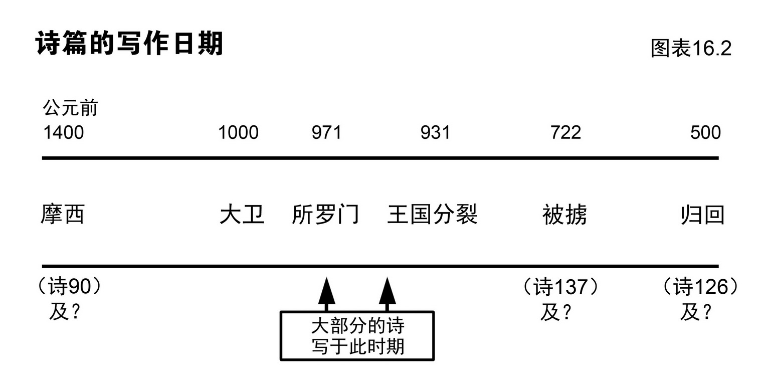 从诗篇的作者和文中的历史资料推测,本书的写作历时约共五百年,即公元前1000至公元前500年之间,请参图表16.2。