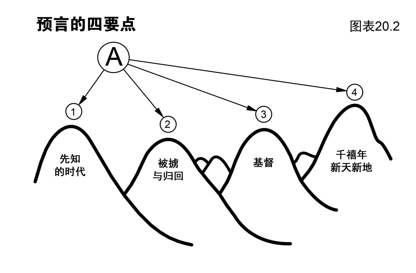 参图表20.2的A,先知如同站在高处向前瞻望,把所见到的讲出来。最常见的是揭发当时盛行的罪恶(参图表20.2中的①);然后向远处望去,看到民族被掳离开故土;又见到犹太人终于被释放归回(参②)。