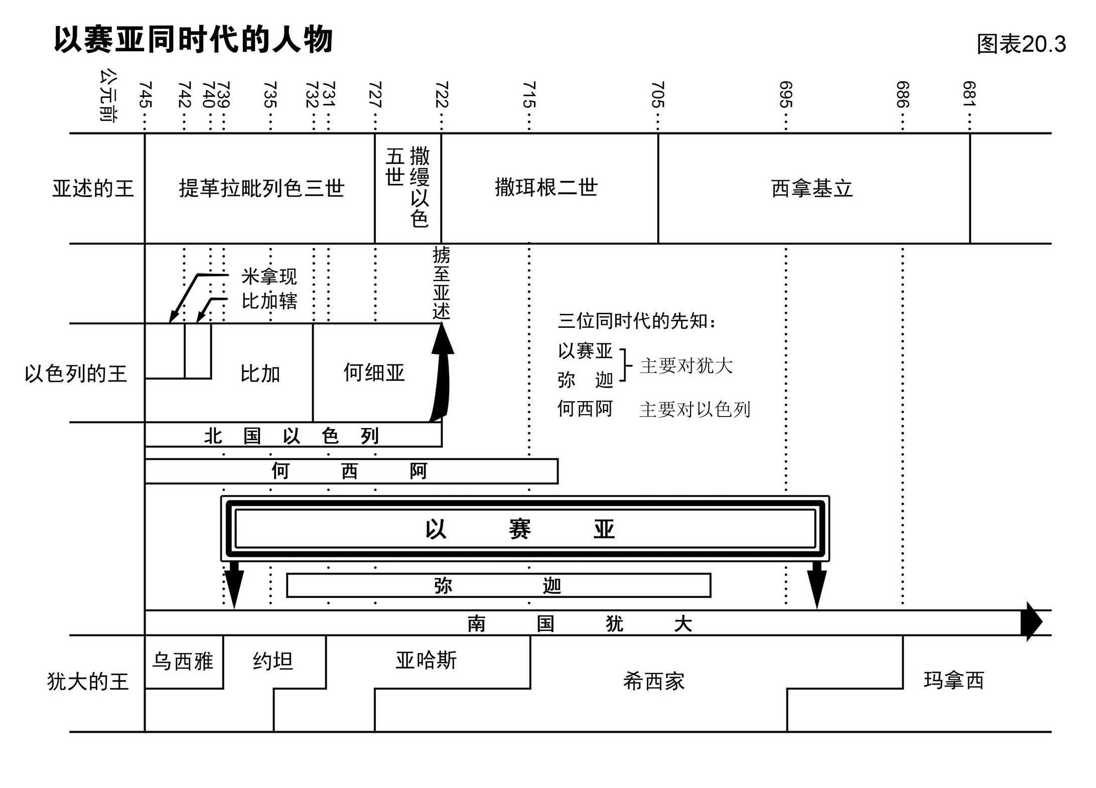 参看图表20.3,可见何西阿、弥迦与以赛亚同时代(参较何1:1;弥1:1)。以赛亚在北国最后的十七年中说预言,不过他的预言却以南国为主要对象。当以色列的王位因罪恶而倾覆时,犹大也逐渐走下坡,不过倾覆较为缓慢而已。以赛亚的历史背景,可参看列王纪下14至21章。