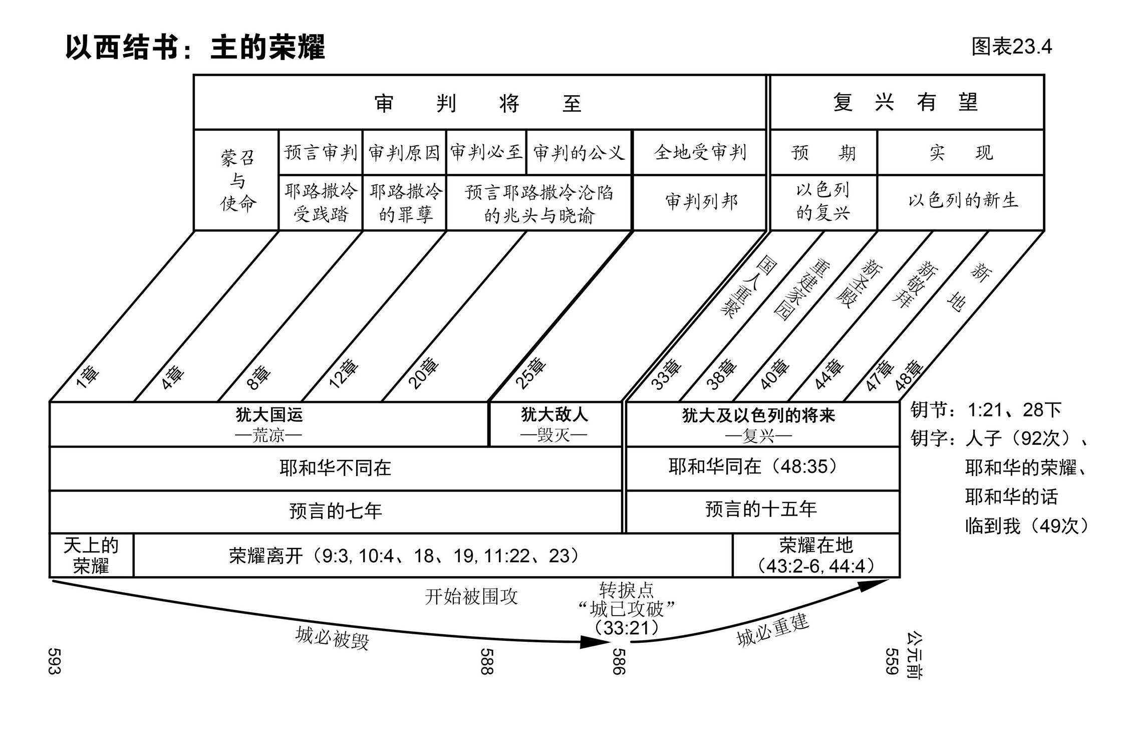 ⑨ 这书有一个转折点,横跨第二、三两部分(见图表23.4底部)。在24章2节,神告诉以西结“巴比伦王已经开始围攻耶路撒冷城”。33章21节就是转折点,报信的说城已经被攻破,在24章12节以前,以西结的信息主要是“城必被毁”;之后,以西结把他的预言转到另一个高潮,传讲“城必重建”。在24章里,先知得知耶路撒冷陷落后,他的舌头才得释放,可以传讲新的信息——希望;而百姓亦因耶路撒冷陷落已经成为事实而冷静下来,开始接受以西结的信息了(24:25-27)。