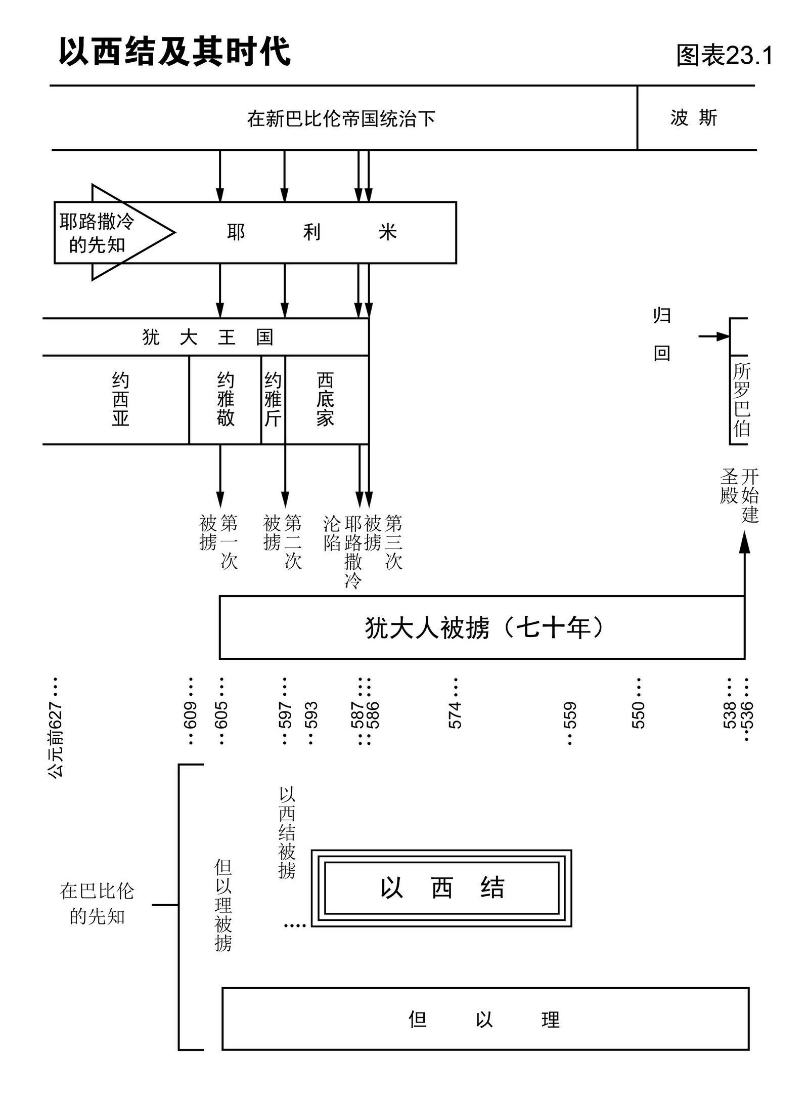 从图表23.1可见,但以理和以西结都在被掳至巴比伦之后才开始先知的工作。但以理于公元前605年尼布甲尼撒王第一次入侵耶路撒冷时被掳,并在同年开始作先知(但1:1-7);以西结于公元前597年与约雅斤王及众多国民在尼布甲尼撒王第二次入侵时被掳至巴比伦(王下24:10-16),约五年后,蒙召为先知。因此,在耶路撒冷失陷的前二十年中,耶利米先知在犹大孤军作战,但以理与以西结则在被掳时期同作先知。