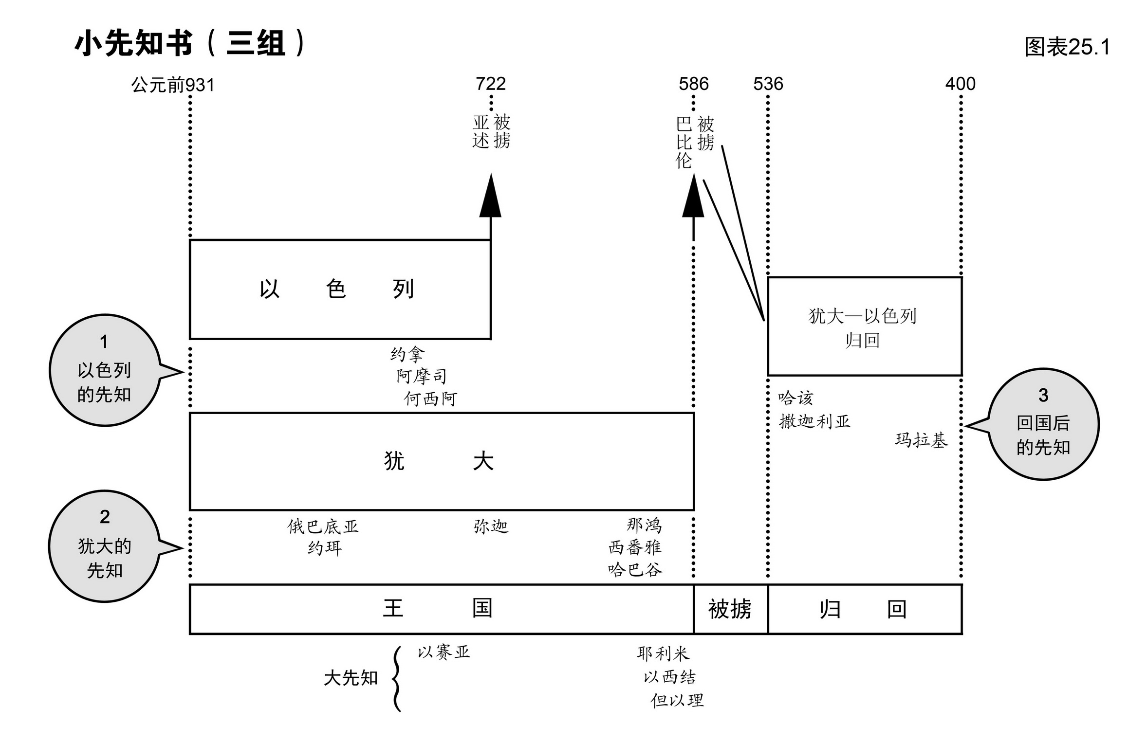 按职事而言,小先知书可分为三组(参图表25.1):以色列的先知、犹大的先知,以及被掳归回后的先知。三组小先知书分别按书写年代顺序编排见图表25.2.