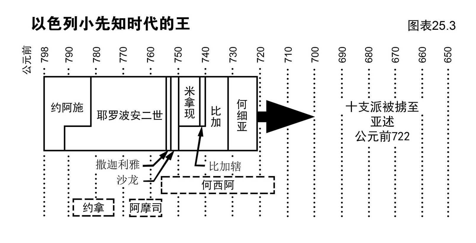 图表25.3列出与三位先知同时代的王。有时两王同时执政(例如:公元前793至公元前782年,约阿施与耶罗波安一同秉政)。在何西阿侍奉期间,以色列共有几个王?留意在何西阿侍奉后期,以色列被亚述掳去。以色列的败亡是神对罪的惩罚,这表明何西阿肩负的是怎样的属灵负担?以色列王的名单和资料,请参本书附录1。